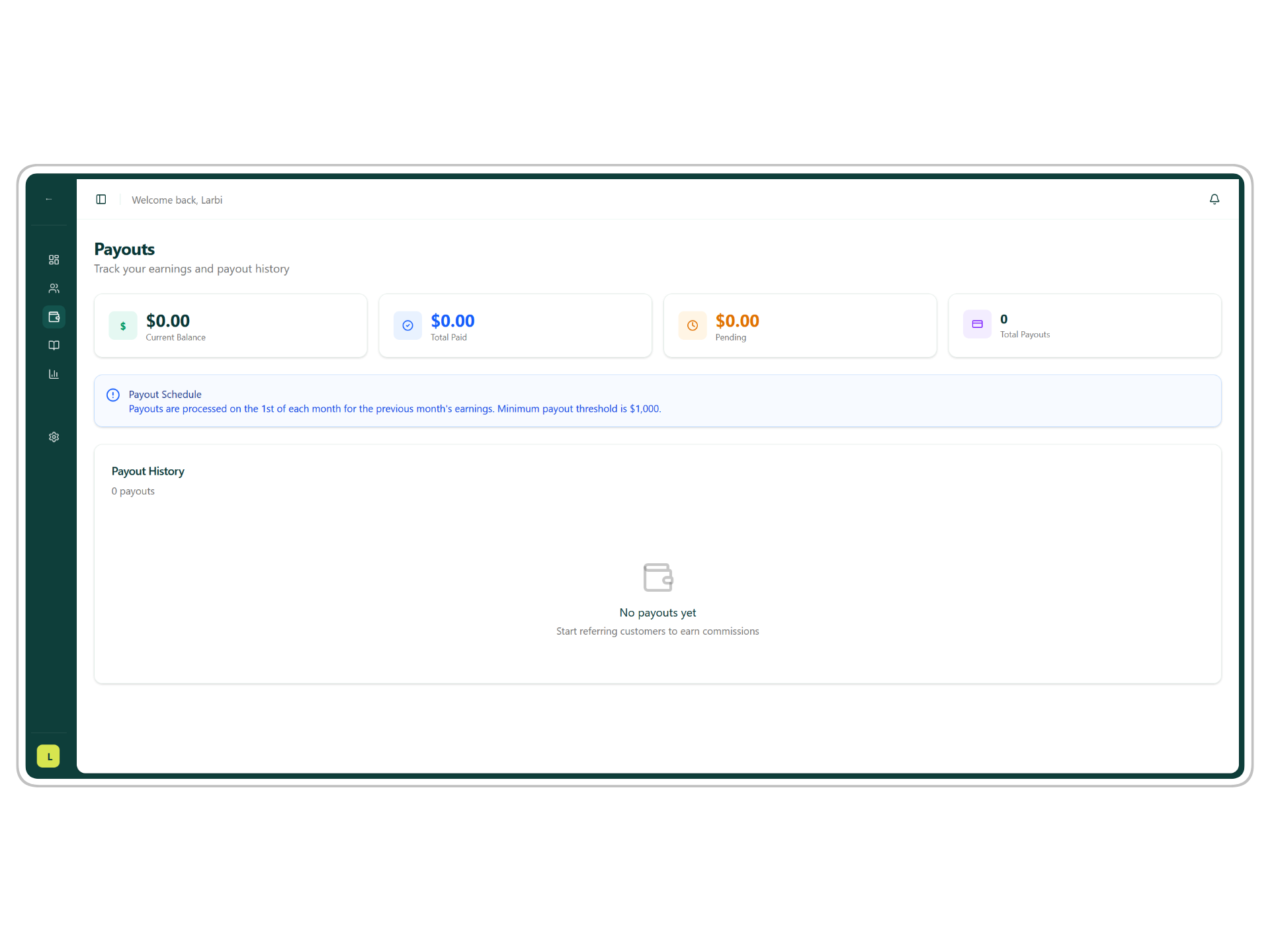 - Automated Payout Engine: Logic-driven commission processing with support for multiple payout methods and scheduled cycles (NET-15/30).