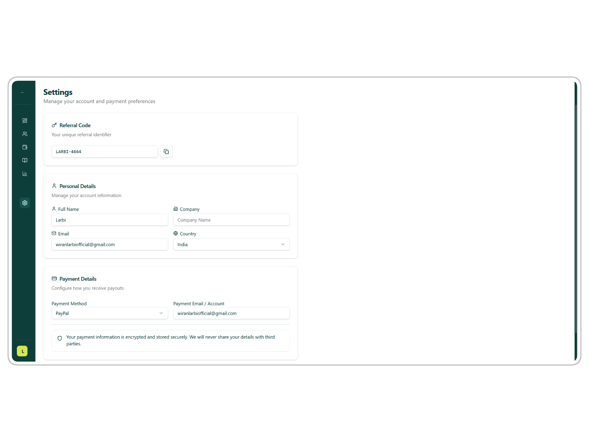 The system leverages Prisma ORM and PostgreSQL for reliable data persistence, managing the intricate relationships between leads, approved conversions, and historical payouts. Authentication and security are prioritized using JWT and industry-standard encryption to protect partner earnings data.